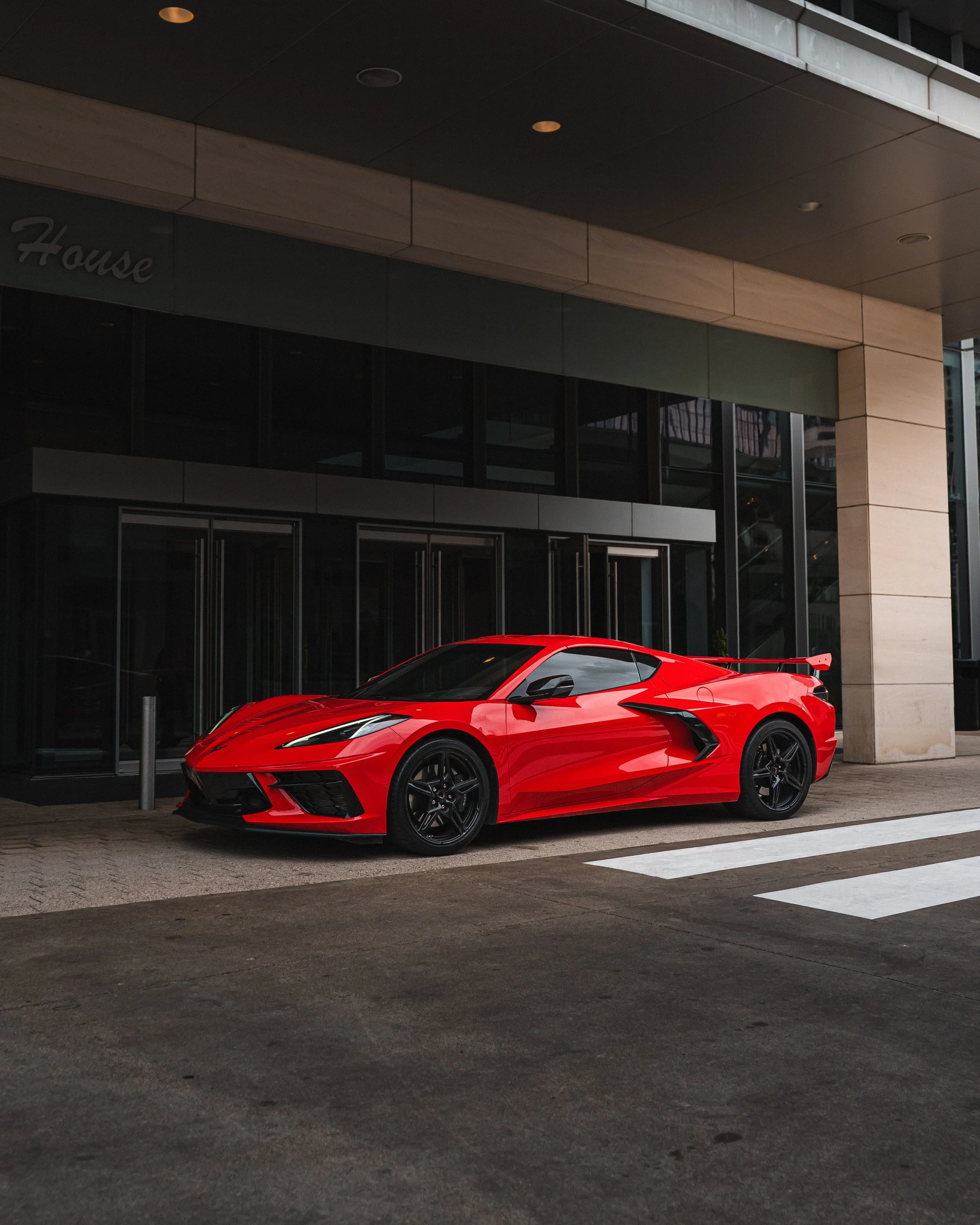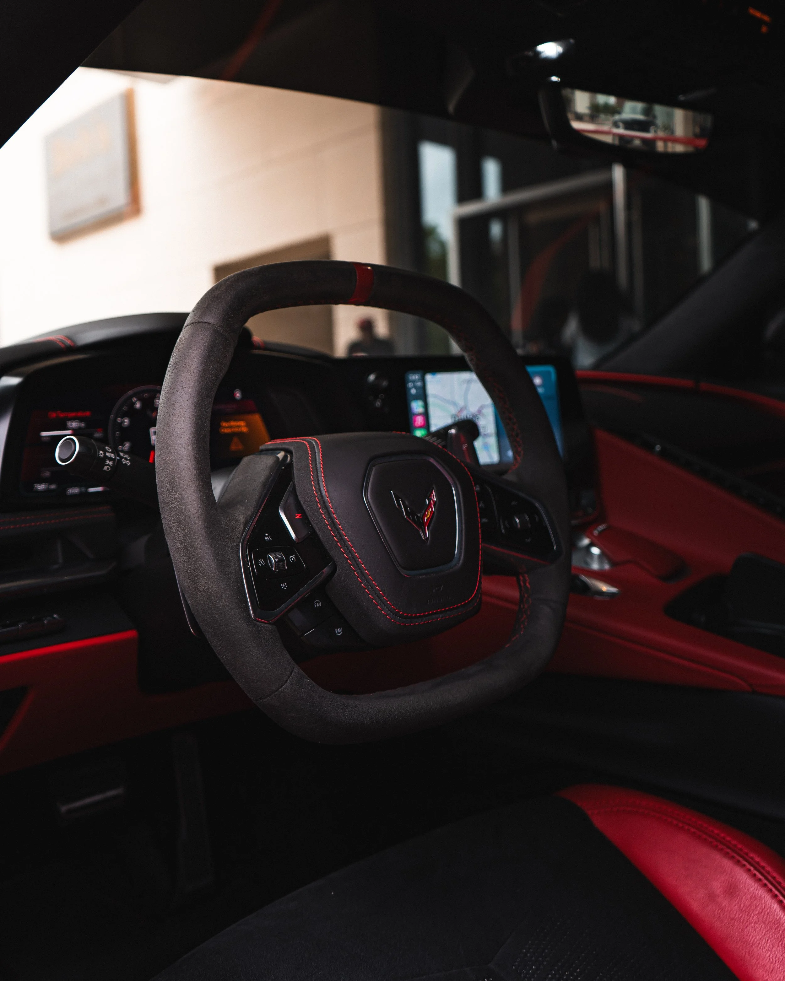 Corvette C8 3LT Z51 — finished in striking red with a red-and-black Alcantara interior. Mid-engine design delivers exotic-car balance and razor-sharp handling. The Z51 package adds performance suspension, larger brakes, and performance exhaust for a deeper, more aggressive note. 3LT trim surrounds the cabin in premium materials and advanced tech, including head-up display and performance data recorder. Ideal for date nights, weekend escapes, or statement arrivals. Book the Corvette C8 today and take the wheel of pure American performance.
